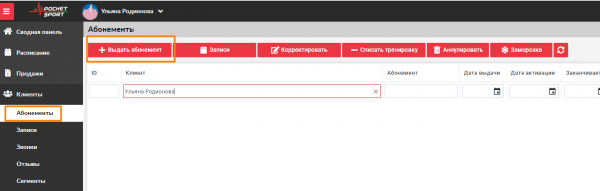 Для того, чтобы выдать абонемент клиенту вручную нажмите на кнопку Выдать абонемент.