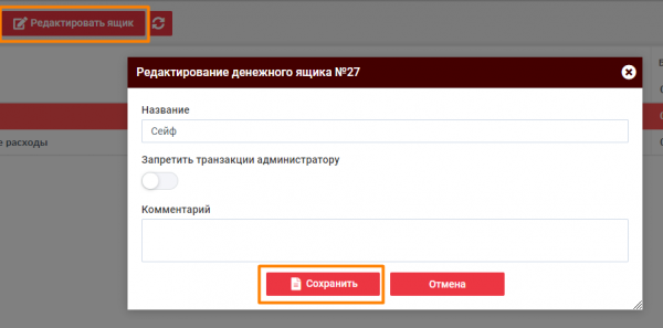 Для того, чтобы отредактировать денежный ящик нажмите на кнопку Редактировать ящик. В открывшемся окне внесите нужные изменения и нажмите Сохранить.
