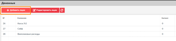 На открывшейся странице отображается весь список денежных ящиков, а также их баланс. Чтобы добавить денежный ящик нажмите на кнопку Добавить ящик в меню управления.