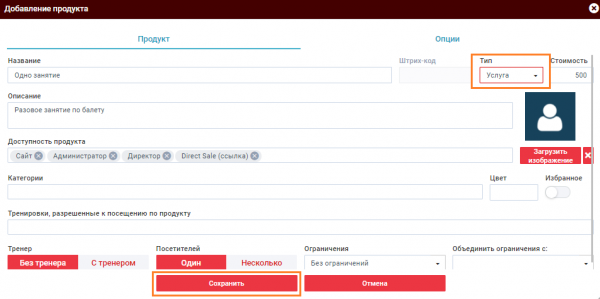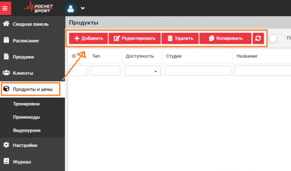 После настройки зала добавьте и отредактируйте информацию о услугах вашей студии. В разделе продукты и цены добавляются и настраиваются все услуги, которые предоставляются компанией. Все продукты разделены по типу: услуга, абонемент, сертификат, товар.
