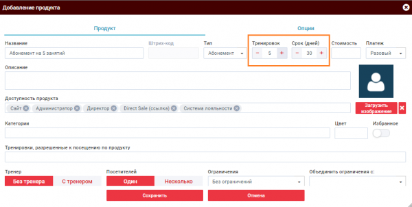В открывшемся окне настройте абонемент. Помимо базовых настроек продукта, в абонементе нужно указать: