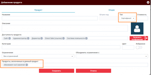 Продукт с типом сертификат предоставляет возможность оформить любую услугу или абонемент в подарок. В открывшемся окне настройте сертификат. Помимо базовых настроек продукта, в сертификате нужно указать: