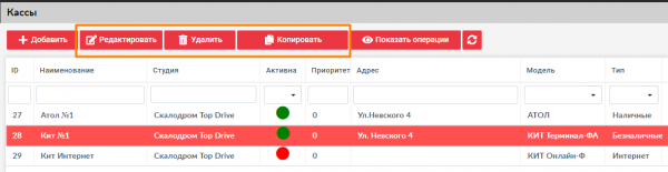 После того, как вы создали кассы, их можно редактировать, удалять и копировать. Для этого нужно нажать на любую кассу и воспользоваться соответствующей кнопкой в меню управления.