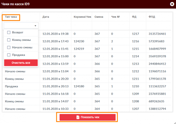 Также можно посмотреть все операции, проходимые по данной кассе. Для этого в меню управления нажмите кнопку Показать операции. В открывшемся окне будут отображаться все чеки по кассе. Список можно отфильтровать по типу чека. Чтобы просмотреть интересующий вас чек, нажмите на него, далее на кнопку Показать чек.