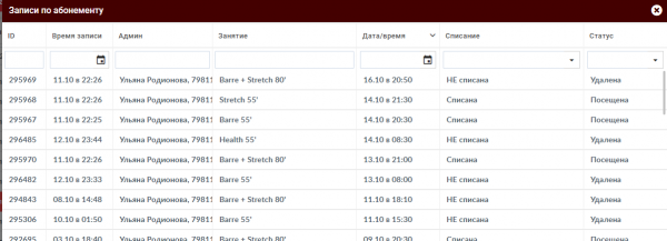 В открывшемся окне вы будете видеть всю информацию о записи клиента на занятия. Названия тренировок, дата и время записи, а также статус - посещена ли тренировка или нет.