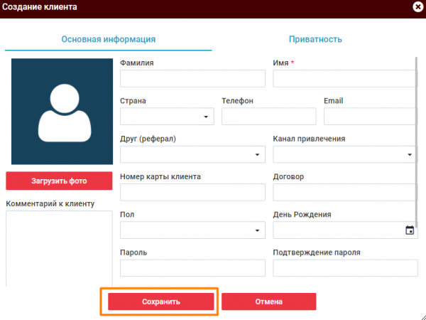 Для того, чтобы добавить клиента, в меню управления нажмите Добавить. В открывшемся окне создания клиента заполните всю информацию о нем и нажмите Сохранить