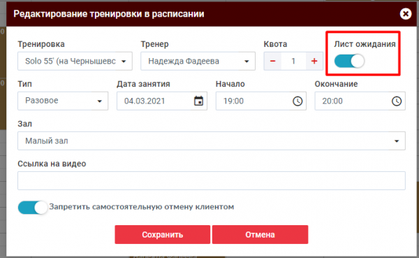 При создании тренировки в расписании Лист ожидания для данных тренировок будет включен автоматически, но вы также можете включить или выключить лист ожидания для каждой тренировки в расписании.