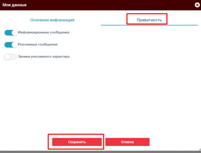 4. Тип уведомления - доступно два типа уведомлений информационное и промоакция/реклама. Выбрав тип уведомления, Вы можете отключить для клиента, например, нежелательную рекламу. Для этого в данных клиента нужно перейти на вкладку приватность и включить или выключить информационные и рекламные сообщения.