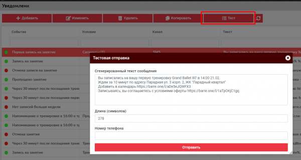 С помощью кнопок добавить, изменить, удалить, копировать - вы можете редактировать уведомления. Кнопка Тест - нужна для тестовой отправки сообщения. Вы можете отправить уведомление на свой номер телефона и увидеть, как оно будет выглядеть. Введите текст сообщения и номер телефона, нажмите отправить.