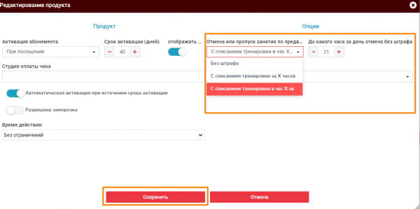 Для абонементов и услуг доступна опция настройки поздней отмены тренировки. Для этого перейдите в раздел главного меню продукты и цены. Нажмите на нужный абонемент или услугу, нажмите на кнопку Редактировать на панели управления и перейдите на вкладку Опции. В окне Отмена или пропуск занятия по предварительной записи выберите: