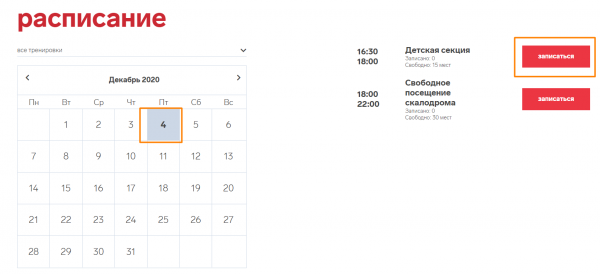 В виджет автоматически подтягиваются все тренировки из вашего расписания. Можно нажать на любую дату и записаться на любую тренировку с помощью кнопки записаться. Далее ввести и подтвердить свой номер телефона, к которому будет привязана запись.