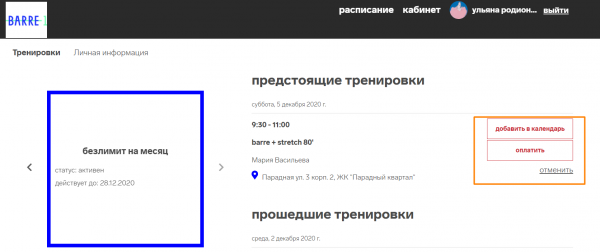 В личном кабинете вам будет доступна информация о ваших абонементах, а также о всех прошедших и предстоящих записях. Можно добавлять тренировки в календарь, отменять их, а также проводить оплату прям из кабинета.