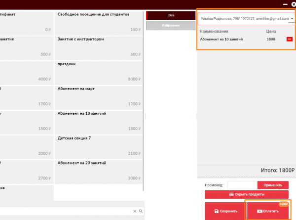В открывшемся окне выбрать продукты для оплаты, а также клиента, который будет совершать оплату. Далее нажать на кнопку Оплатить.