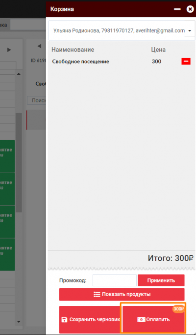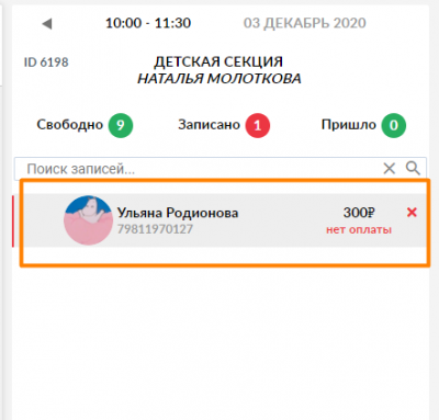 Если клиент уже записан на занятие, но не оплатил его, можно принять оплату сразу из окна записи. Для этого кликните на клиента без оплаты два раза, окно корзины с оплатой нужной тренировки откроется автоматически.