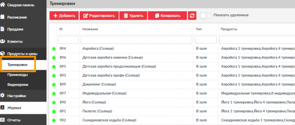 В разделе тренировки можно добавить и настроить все тренировки, проводимые в студии. Для того, чтобы перейти к списку тренировок в левом боковом меню нажмите продукты и цены, далее в выпадающем списке нажмите тренировки
